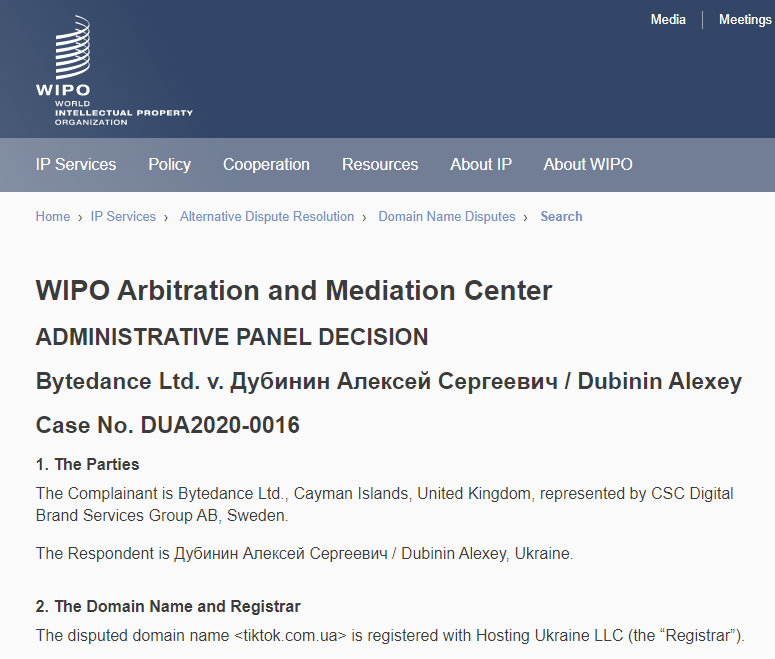 該域名的后綴.ua是烏克蘭的國家代碼頂級(jí)域名。字節(jié)跳動(dòng)根據(jù).UA域名爭議解決政策,向世界知識(shí)產(chǎn)權(quán)組織(WIPO)提出了爭議解決申請(qǐng),稱其TIK TOK商標(biāo)享譽(yù)國際,在多國有商標(biāo)注冊(cè),且自2017年來一直使用,而爭議域名tiktok.com.ua與其TIK TOK商標(biāo)相同。