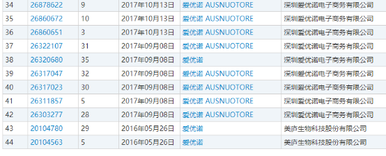 中國(guó)商標(biāo)網(wǎng)顯示,2016年5月26日,美廬生物注冊(cè)申請(qǐng)了第5類及第29類“愛(ài)優(yōu)諾”商標(biāo)。