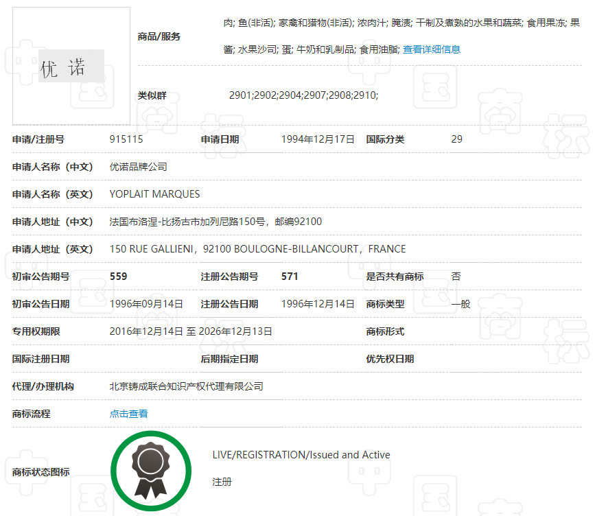 公開(kāi)資料顯示,優(yōu)諾品牌創(chuàng)立于1965年,優(yōu)諾酸奶于2015年來(lái)到中國(guó),致力于將源自限定牧場(chǎng)的高品質(zhì)乳制品帶給中國(guó)消費(fèi)者,同屬乳企,優(yōu)諾品牌與美廬生物存在競(jìng)爭(zhēng)關(guān)系。而早在1994年,優(yōu)諾品牌公司就已提交第29類“優(yōu)諾”商標(biāo),并已核準(zhǔn)注冊(cè)。
