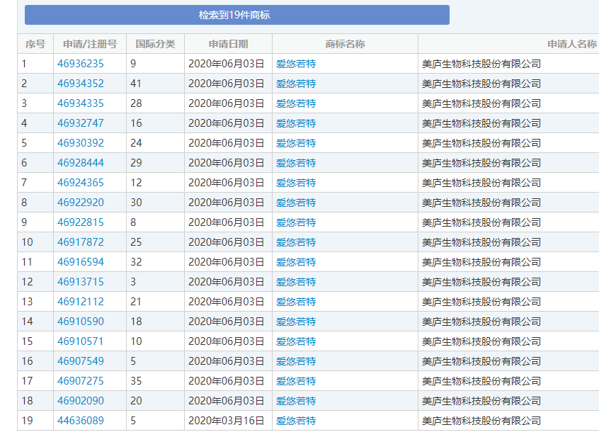 中國(guó)商標(biāo)網(wǎng)顯示,2020年3月16日至6月3日,美廬生物提交了19件“愛(ài)悠若特”商標(biāo)的注冊(cè)申請(qǐng),目前,該19件商標(biāo)注冊(cè)申請(qǐng)均為“等待實(shí)質(zhì)審查”階段,雖然暫時(shí)并未核準(zhǔn)注冊(cè),但相比“愛(ài)優(yōu)諾”商標(biāo)可能遭到無(wú)效的風(fēng)險(xiǎn),目前沒(méi)有被搶注過(guò)的“愛(ài)悠若特”則相對(duì)更為保險(xiǎn)一些。